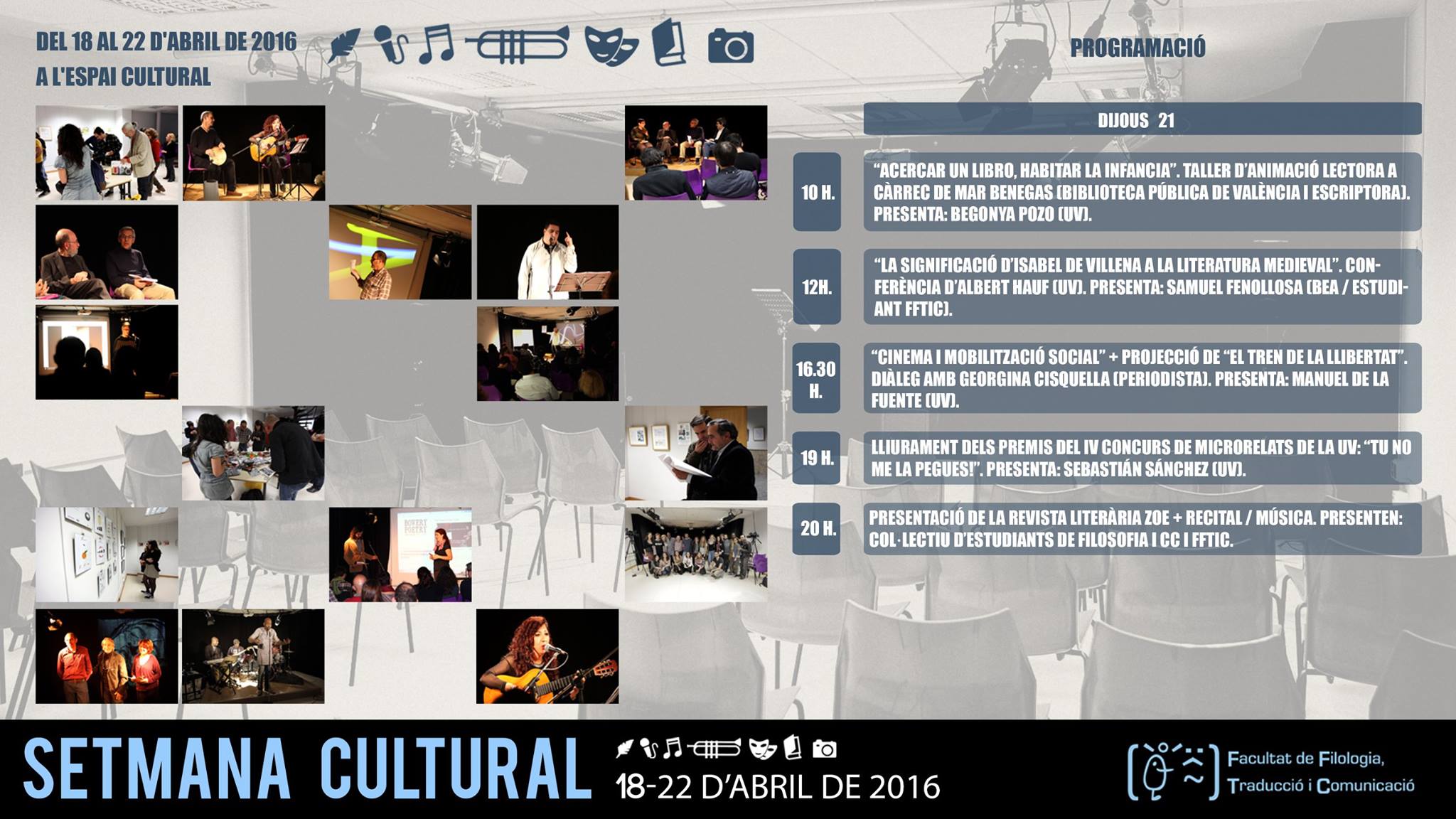 por: dfabregasPublicada el: 15 de abril de 2016 SEMANA CULTURAL UNIVERSITAT DE VALÈNCIA El jueves, a las 10, charla-taller: «Animar a leer, habitar la infancia», por si os apetece.